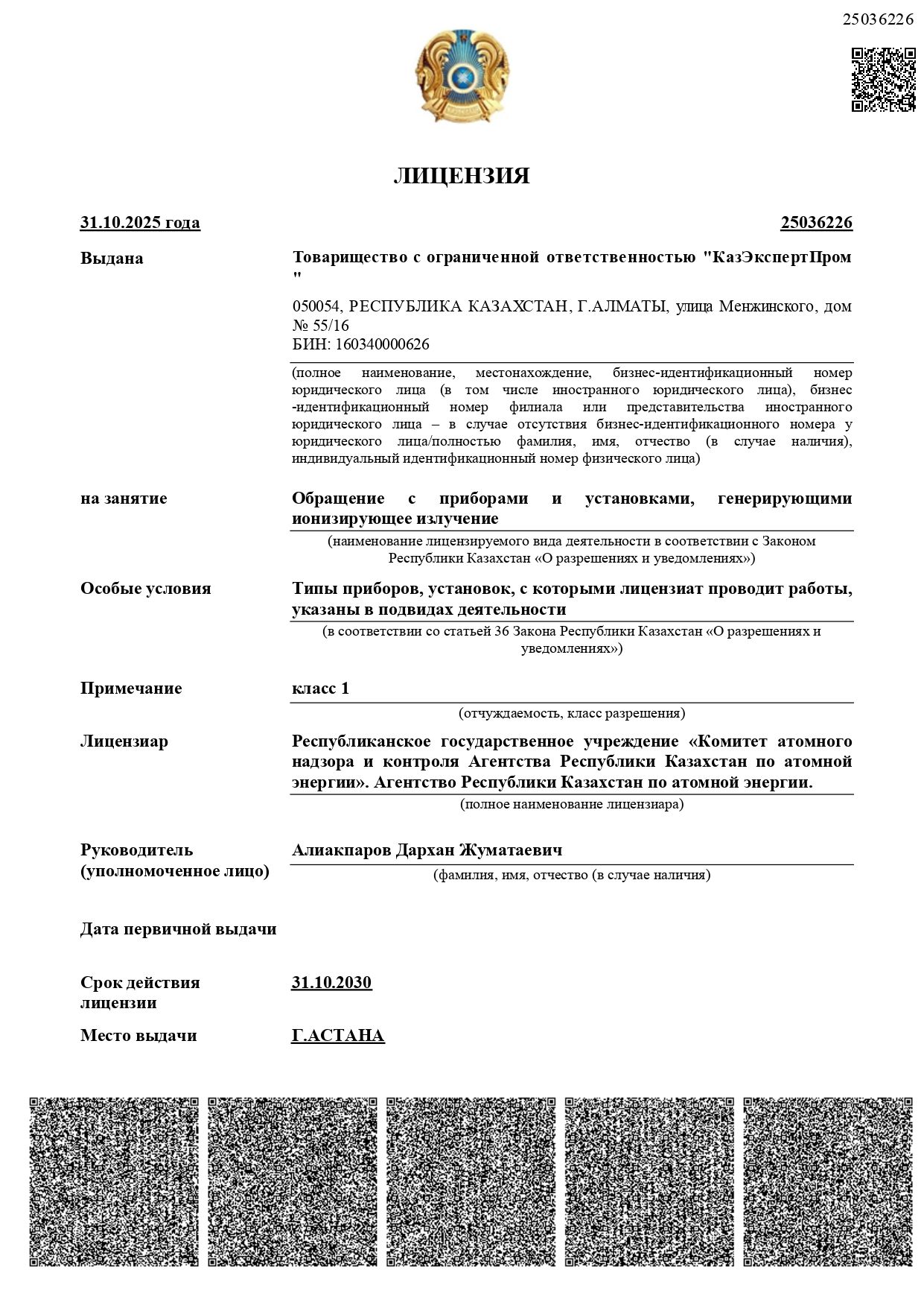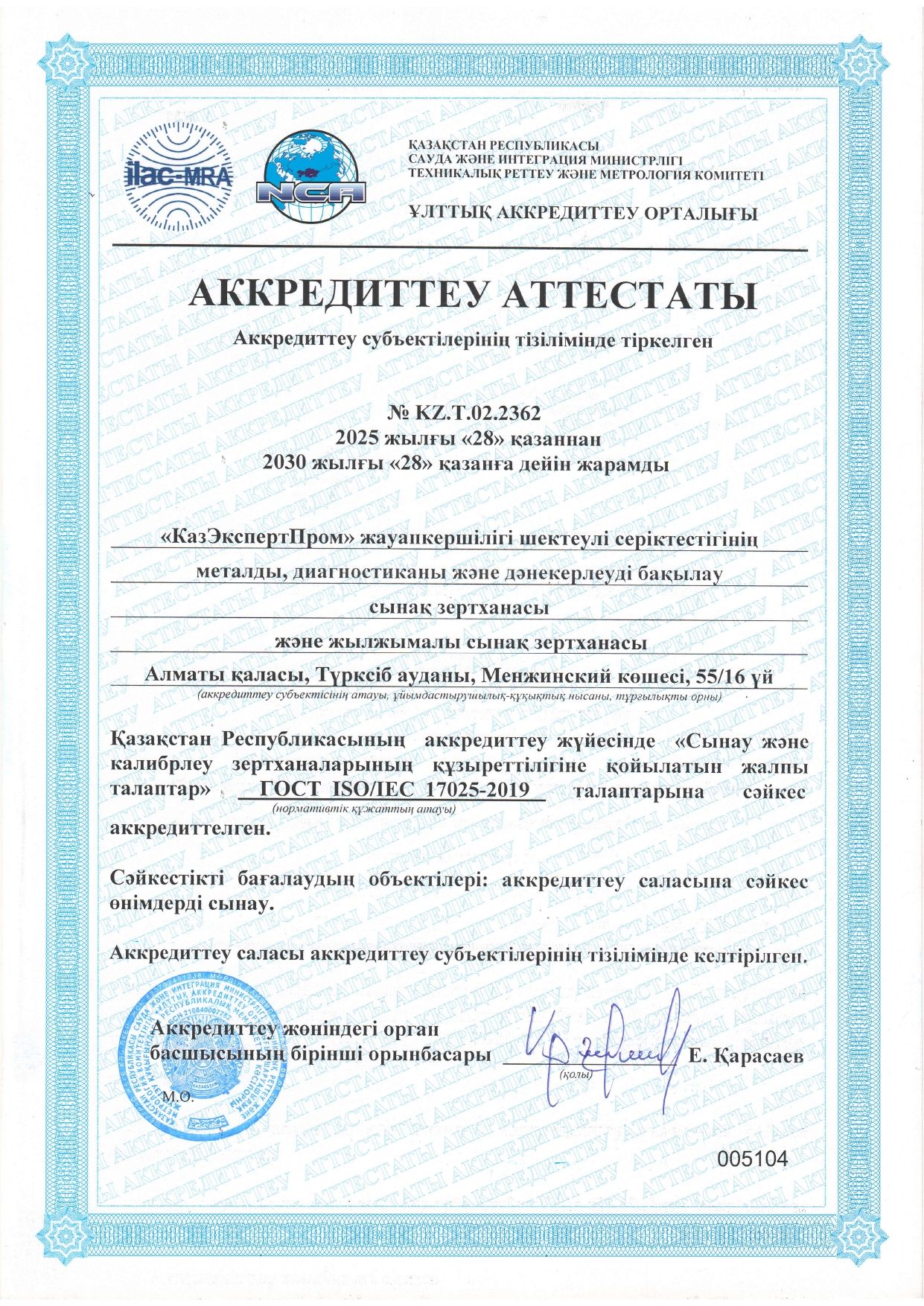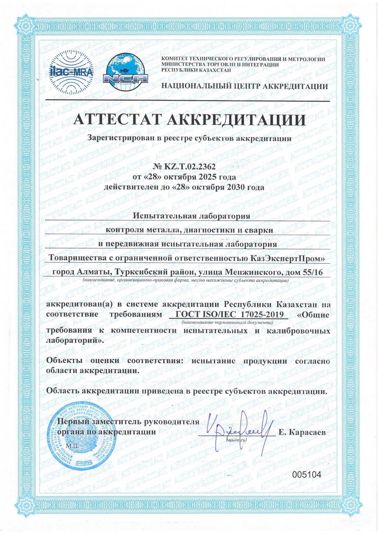 Деятельность испытательной лаборатории неразрушающего контроля мы осуществляем на основании Аттестата Аккредитации на право проведения работ в области промышленной безопасности, выданный Национальным Центром Аккредитации Комитета технического регулирования и метрологии Министерства торговли и интеграции Республики Казахстан. Также компания обладает и другими важными разрешительными документами, такие как Аттестаты на право проведения работ в области промышленной безопасности, Лицензия на право обращения с приборами и установками, генерирующими ионизирующее излучение (радиографический контроль), Свидетельство об оценке состояния измерений в ИЛ КМ Д и С, выданное Национальным центром экспертизы и сертификации, Сертификат соответствия СТ РК ISO 9001-2016 «Системы менеджмента качества», Сертификат соответствия СТ РК OHSAS 18001-2008 «Системы менеджмента профессиональной безопасности и здоровья».