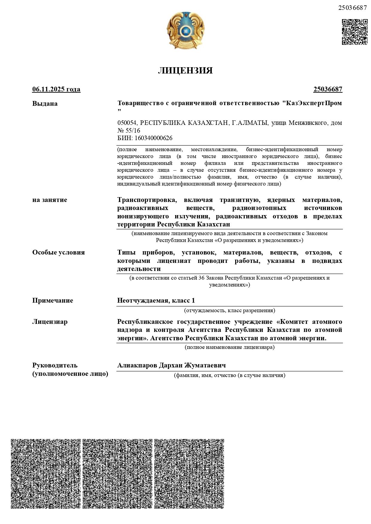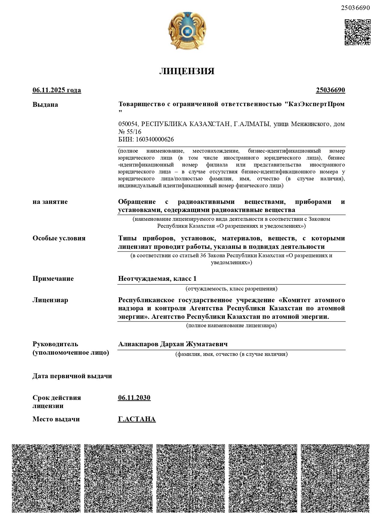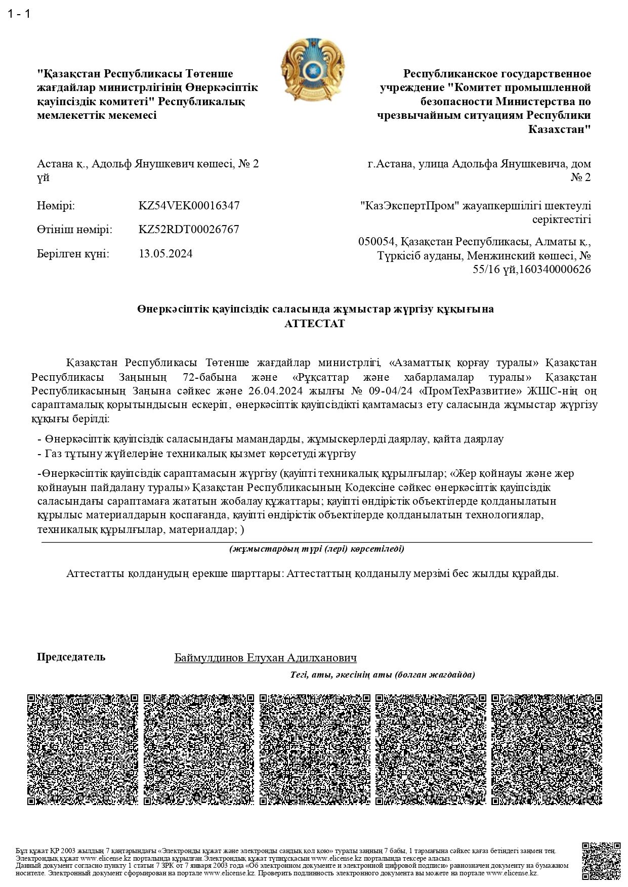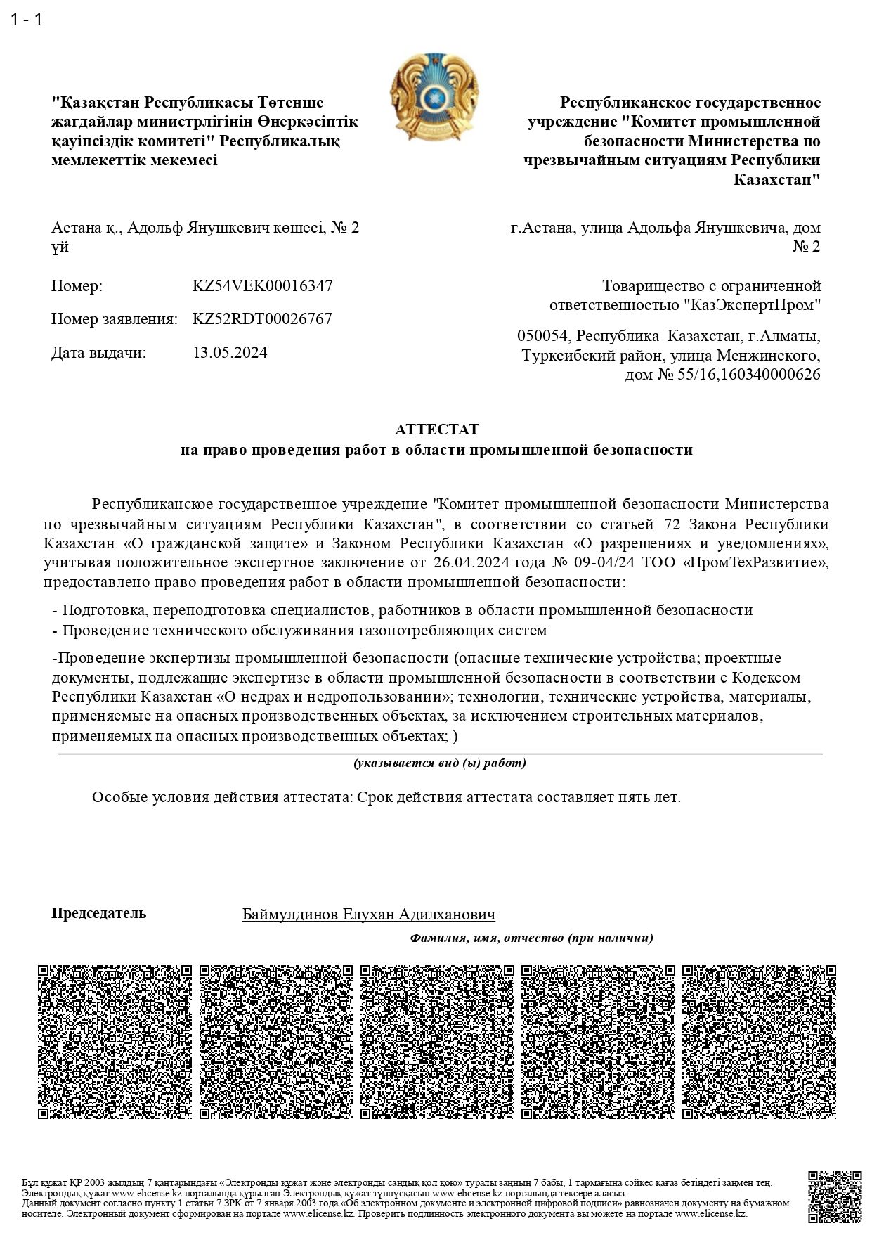 Деятельность испытательной лаборатории неразрушающего контроля мы осуществляем на основании Аттестата Аккредитации на право проведения работ в области промышленной безопасности, выданный Национальным Центром Аккредитации Комитета технического регулирования и метрологии Министерства торговли и интеграции Республики Казахстан. Также компания обладает и другими важными разрешительными документами, такие как Аттестаты на право проведения работ в области промышленной безопасности, Лицензия на право обращения с приборами и установками, генерирующими ионизирующее излучение (радиографический контроль), Свидетельство об оценке состояния измерений в ИЛ КМ Д и С, выданное Национальным центром экспертизы и сертификации, Сертификат соответствия СТ РК ISO 9001-2016 «Системы менеджмента качества», Сертификат соответствия СТ РК OHSAS 18001-2008 «Системы менеджмента профессиональной безопасности и здоровья».